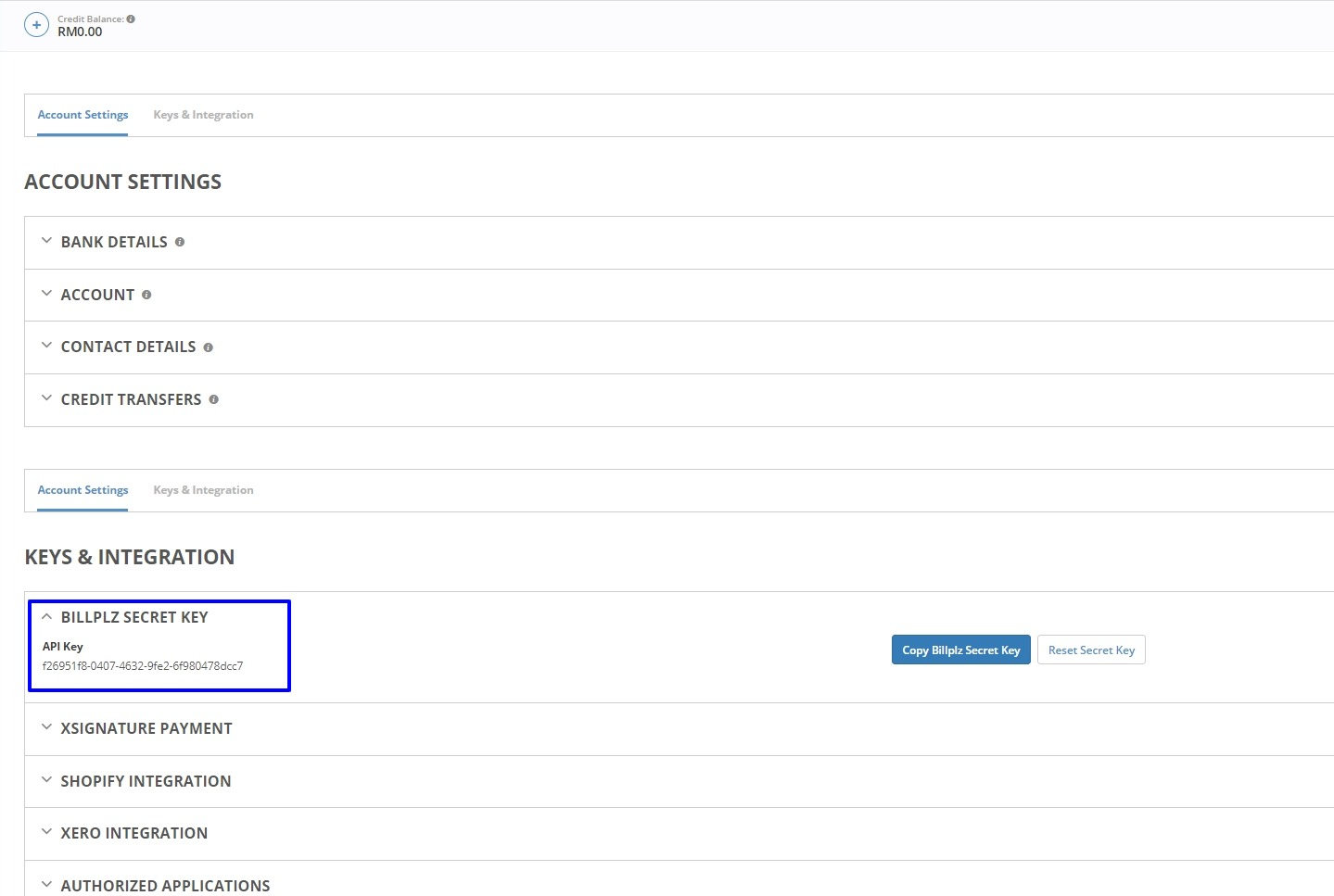 Under Keys & Integration, click on the Copy Billplz Secret Key button, and paste it into your configured settings.