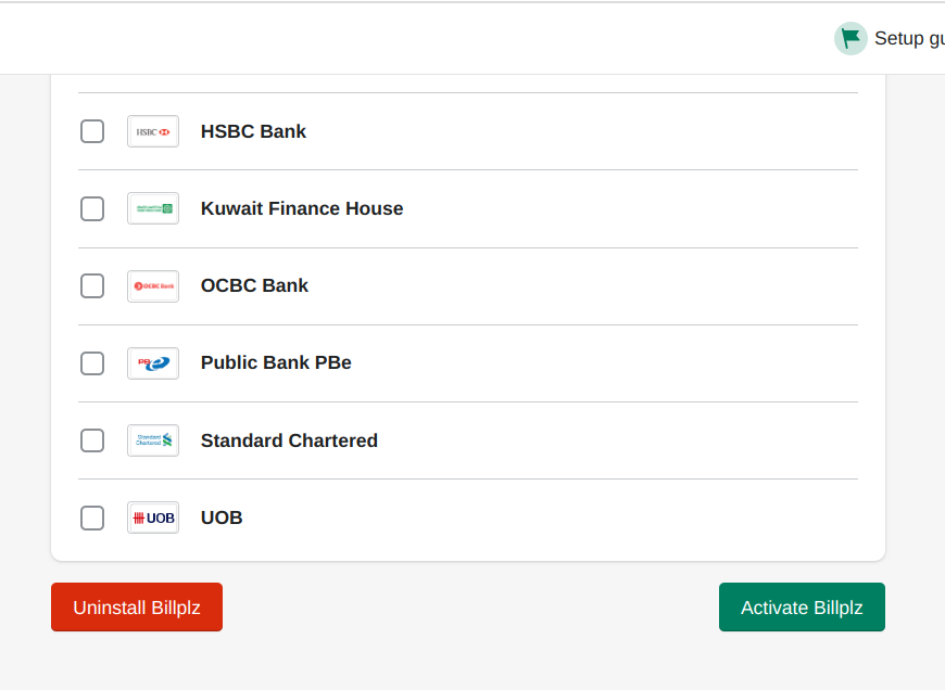 5. Tick the respective payment method logo to be shown on your payment page and click the Activate Billplz button. You may select the respective payment method based on your Billplz account payment method availability.
